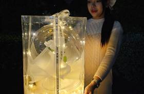บอลลูนดอกไม้กำมะหยี่สุดหรูในกล่องใส พร้อมไฟประดับระยิบระยับ
